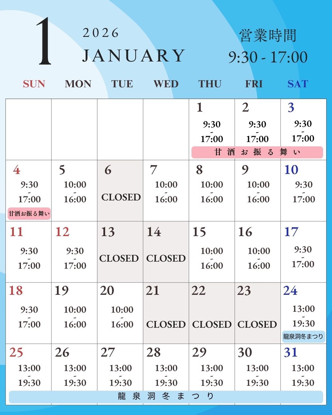 1月の営業日をお知らせいたします。